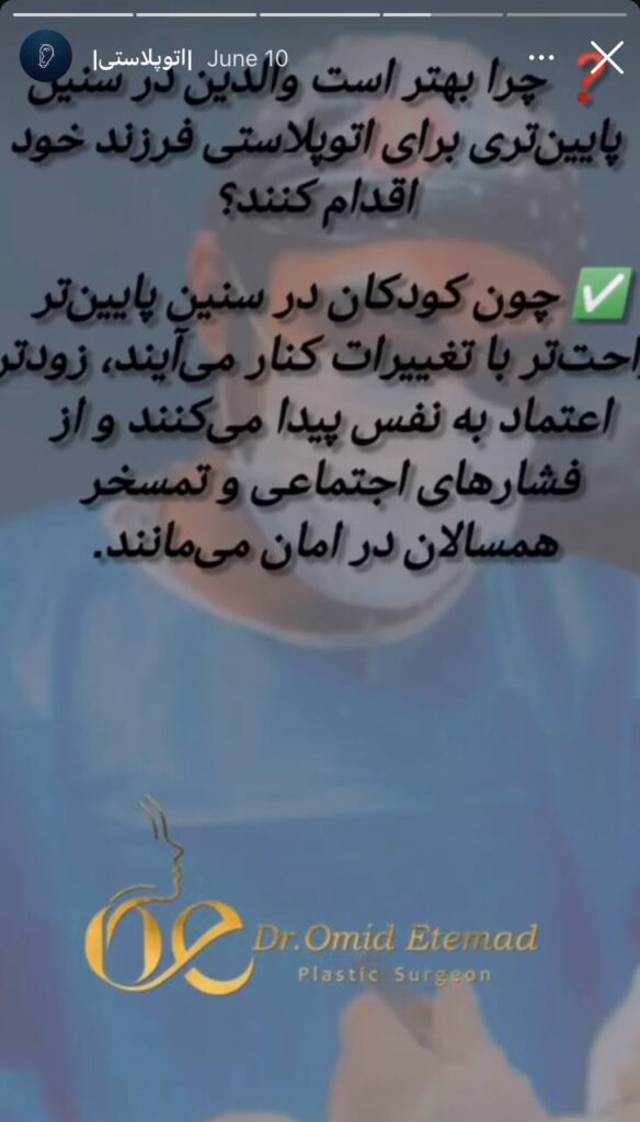 در حال حاضر نمونه کار اتوپلاستی از دکتر اعتماد منتشر نشده استمطب فقط دو روز در هفته باز است