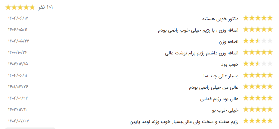 پیدا کردن بهترین دکتر رژیم لاغری در ساری اولین قدم هوشمندانه برای رسیدن به تناسب اندام ماندگار و سلامت جسمانی است. در این مقاله مرجع، به معرفی 10 مورد از بهترین دکتر رژیم درمانی در ساری پرداخته‌ ایم. این لیست با بررسی دقیق نظرات مثبت و منفی زیباجویان ساروی، به‌ صورت کامل و کاربردی گردآوری شده است. شما در ادامه می توانید اطلاعات تماس، نمونه کارها، هزینه ها و تجربیات واقعی زیباجویان را مشاهده کنید.